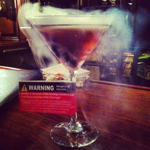 Everyone, and I mean everyone, will tell you the best place to get a drink in Charleston is on the roof of the Market Pavilion Hotel. They’ll be all like “the views!” and “the glamour!” And so maybe you’ll go up there, but maybe it will be winter, and pretty freaking cold. And you’ll get a gin-based cocktail with cucumber wedges floating in it and it will be unspeakably fresh and delicious. But, because it’s winter, and frankly kind of shitty out, the fog will prevent you from seeing those views! And then it will kind of start to sputter and rain, so you’re a little bit like fuck this. So you go downstairs to the lobby bar, a place so blah-ly named Grill 225, and the lady bartender will be like, “Do you want to try our signature Nitrotini?” And you will ask if it’s cool, and she’ll say “It’s pretty cool.” So then, you will be served a cocktail with a warning label on it. The label says: WARNING. Wait for the liquid nitrogen to evaporate. If you don’t, this drink may cause SEVERE and PERMANENT internal damage. It looks pretty. And you drink it. And not only is it cool, it’s dangerously cool. (Sorry).